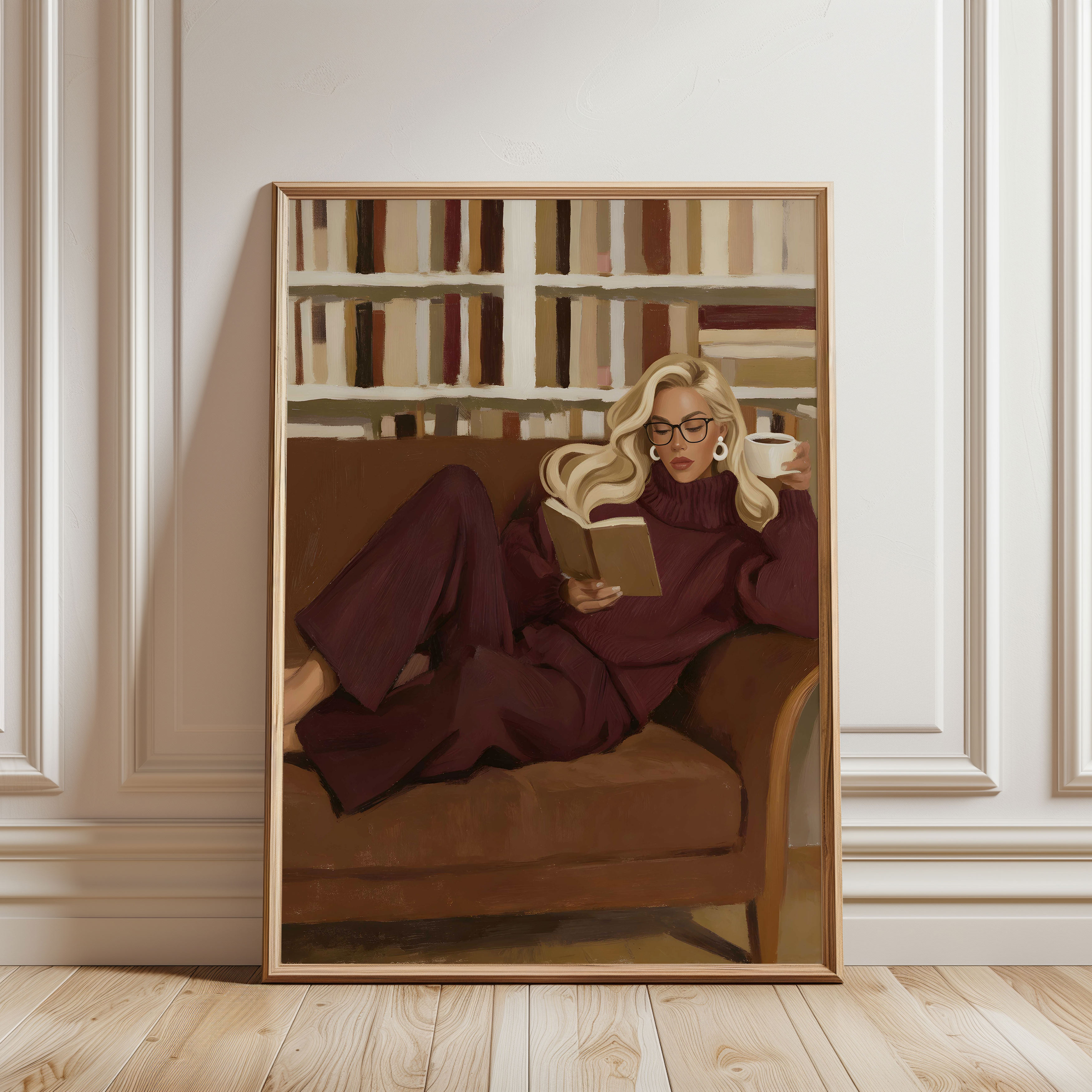 Quiet confidence, uninterrupted. This wall art captures a woman fully immersed in her own rhythm: reading, resting, thinking, and savoring a slow moment surrounded by books. It’s a visual reminder that depth, intelligence, and presence don’t need to be loud to be powerful. Best placed near your favorite chair, bookshelf, or morning coffee spot, where quiet moments are honored and intention sets the tone for the day.
